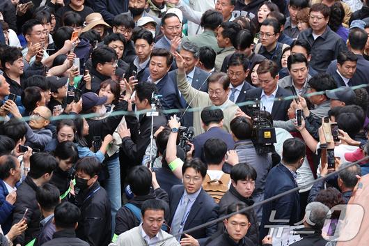 (영동=뉴스1) 안은나 기자 = 이재명 더불어민주당 대통령 후보가 골목골목 경청투어 이틀차인 6일 오후 충북 영동군 영동중앙시장을 찾아 인사하고 있다. 2025.5.6/뉴스1coinlocker@news1.krCopyright ⓒ 뉴스1. All rights reserved. 무단 전재 및 재배포, AI학습 이용 금지.