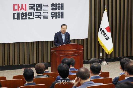 대선 후보 단일화를 두고 국회에서 6일 열린 국민의힘 의원총회에서 권영세 비대위원장이 모두 발언을 하고 있다. 한수빈 기자 |