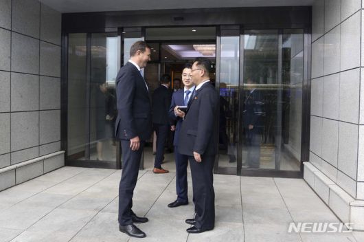 [평양=AP/뉴시스] 김정규(오른쪽) 북한 외무성 부상이 지난해 7월 23일 북한을 방문한 막심 리젠코프 벨라루스 외무장관을 평양공항에서 영접하고 있다. 2025.05.06. |
