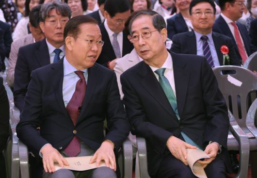 지난 5일 서울 종로구 조계사에서 열린 불기 2569년 부처님오신날 봉축법요식에서 한덕수 무소속 대통령 선거 예비후보(오른쪽)와 권영세 국민의힘 비상대책위원장이 대화하고 있는 모습.(사진=연합뉴스) |