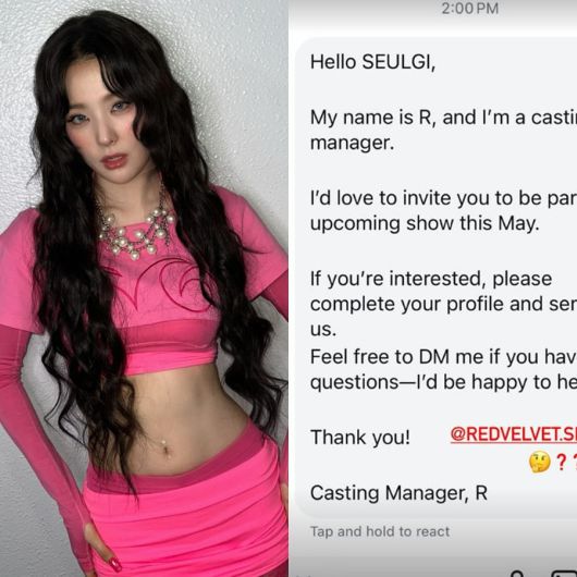 그는 "I'd love to invite you to be part of an upcoming show this May"라며 5월에 있을 쇼에 아이린과 슬기를 초대하고 싶다고 했다. 발신인은 메시지 속 수신인의 이름이 들어가는 자리에 IRENE, SEULGI 이름만 바꿔 넣었다.