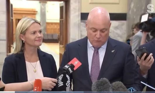크리스토퍼 럭슨 뉴질랜드 총리와 집권 국민당 소속의 캐서린 웨드 의원이 6일 16세 이하 청소년의 소셜미디어 접근을 제한하는 법안 발의를 기자들에게 설명하고 있다. 뉴질랜드 언론 스텁 누리집 갈무리