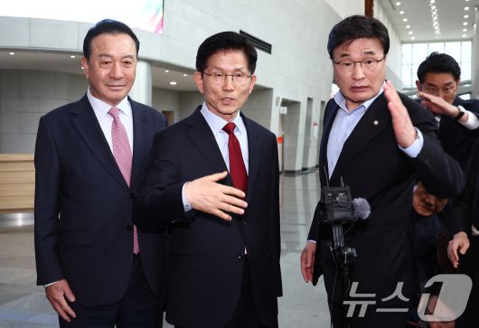 (포항=뉴스1) 김민지 기자 = 김문수 국민의힘 대통령 후보가 6일 경북 경주시 HICO(정상회의장) 미디어센터에서, 단일화 문제를 놓고 당 지도부와 갈등을 빚고 있자 일정 중단을 선언하고 있다. 오른쪽부터 김대식 의원, 김 후보, 엄태영 의원. 2025.5.6/뉴스1