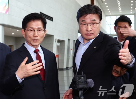 (포항=뉴스1) 김민지 기자 = 김문수 국민의힘 대통령 후보가 6일 경북 경주시 HICO(정상회의장) 미디어센터에서, 단일화 문제를 놓고 당 지도부와 갈등을 빚고 있자 후보 일정 중단을 선언하고 있다. 오른쪽 김대식 의원. 2025.5.6/뉴스1kimkim@news1.krCopyright ⓒ 뉴스1. All rights reserved. 무단 전재 및 재배포, AI학습 이용 금지.