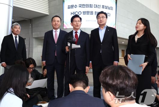 (포항=뉴스1) 김민지 기자 = 김문수 국민의힘 대통령 후보가 6일 경북 경주시 HICO(정상회의장) 미디어센터에서, 단일화 문제를 놓고 당 지도부와 갈등을 빚고 있자 일정 중단을 선언하고 있다. 오른쪽부터 김대식 의원, 김 후보, 엄태영 의원. 2025.5.6/뉴스1