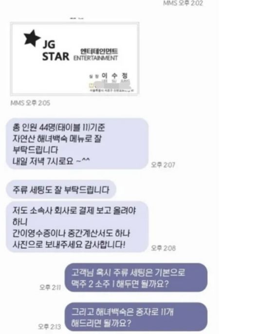 캡처본에 따르면 사칭범은 허위로 만든 명함을 보내며 "총인원 44명 기준 자연산 해녀백숙 메뉴로 잘 부탁드린다. 내일 저녁 7시로", "주류 세팅도 잘 부탁드린다", "저도 소속사 회사로 결제 보고 올려야 하니 간이영수증이나 중간계산서도 하나 사진으로 보내달라" 등의 요청을 전했다.