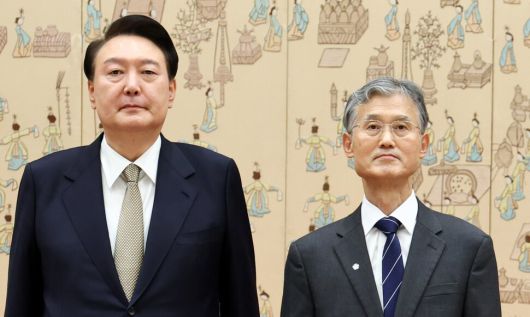 윤석열 대통령이 2023년 12월8일 서울 용산 대통령실 청사에서 조희대 신임 대법원장에게 임명장을 수여한 뒤 기념 촬영을 하고 있다. 대통령실사진기자단 |