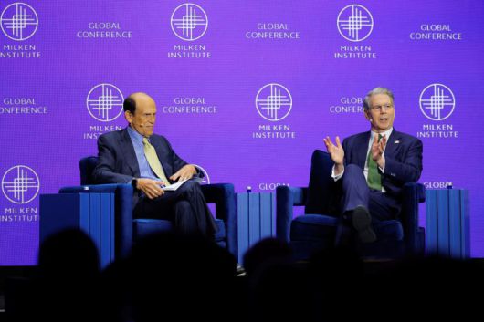 스콧 베선트 미국 재무장관(오른쪽)이 5일(현지시간) 미국 로스앤젤레스(LA)에서 개최된 '밀컨 글로벌 콘퍼런스 2025'에서 대담을 하고 있다. 로이터연합뉴스 |