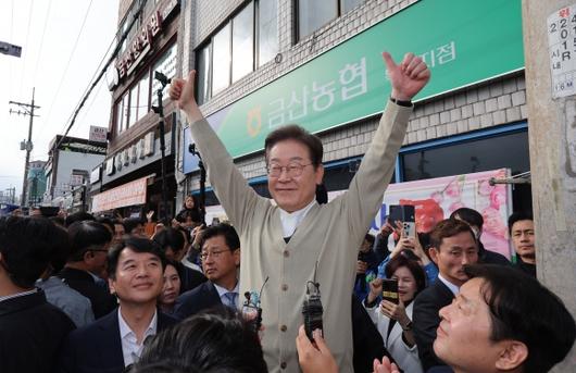 금산군 금산터미널 일대에서 연설하는 이재명 후보 - 이재명 더불어민주당 대선 후보가 ‘골목골목 경청투어:국토종주편’에 나선 6일 충남 금산군 금산터미널 일대에서 연설을 하고 있다. 연합뉴스 |