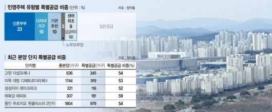대표적으로 고양시 덕양구에서 선보이는 '고양 더샵포레나'는 총 분양 물량이 636가구다. 이 가운데 특공으로 배정된 물량은 345가구로 54%를 기록했다. 수원시 장안구 이목지구에서 공급되는 '북수원이목지구 대방 디에트르 더 리체Ⅱ'도 전체 가구(1744가구)의 53%인 919가구가 사회적 배려 계층에게 배분됐다. 용인시에서 공급된 '용인 푸르지오 원클러스터 2단지'도 총 분양가구 1804가구 가운데 54%인 979가구가 특별공급이다. 지방도 사정은 다르지 않다. 울산에서 선보인 '태화강 에피트'은 특공 비중이 59%에 달했다.
