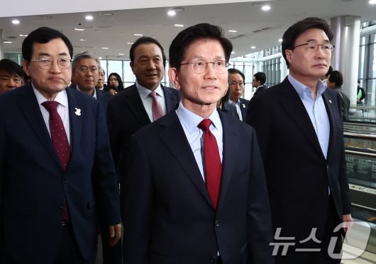(포항=뉴스1) 김민지 기자 = 김문수 국민의힘 대통령 후보가 6일 경북 경주시 HICO(정상회의장) 미디어센터에서 단일화 문제를 놓고 당 지도부와 갈등을 빚고 있는 가운데 김 후보 설득에 나선 김대식, 엄태영 의원과 이동하고 있다. 2025.5.6/뉴스1kimkim@news1.krCopyright ⓒ 뉴스1. All rights reserved. 무단 전재 및 재배포, AI학습 이용 금지.