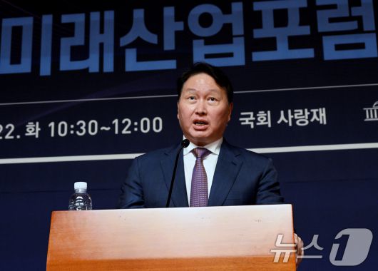 최태원 대한상공회의소 회장이 22일 오전 서울 여의도 국회에서 열린 국회미래산업포럼 발족식에 참석해 기조연설을 하고 있다. (공동취재) 2025.4.22/뉴스1 ⓒ News1 안은나 기자 |