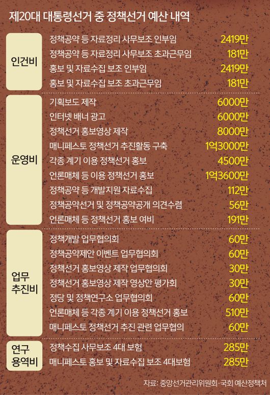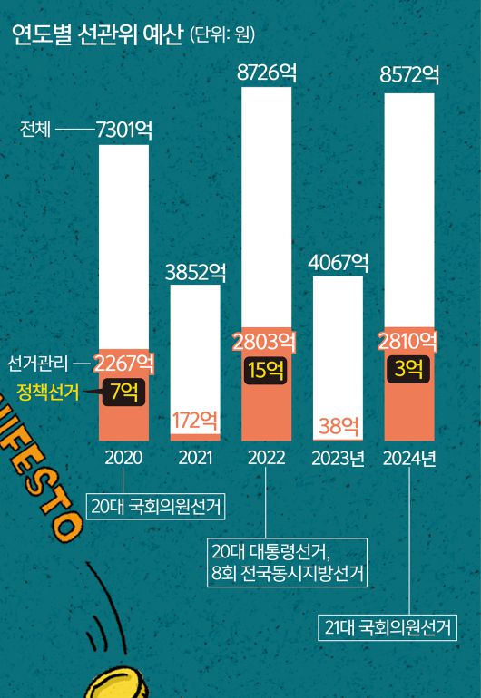 적은 정책선거 예산액에 비해 같은 기간 정당 보조금 등 정당발전지원에 4391억원, 선거연수원·청사 등 기관운영지원에 2356억원, 기본경비로 777억원, 선거관리지원에 45억원 등을 썼다. 김우철 서울시립대 세무학과 교수는 “선관위의 전체 예산 및 선거관리비용에 비하면 정책선거 및 매니페스토 예산은 말도 안 되게 적다”며 “실효성을 기대할 수 없을 만큼 명목상 금액에 불과해 보인다”고 혹평했다.