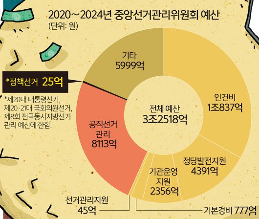 이번 6·3대선을 위해 약 5000억원의 예산이 소요될 것이란 추정이 나온다. 지난달 8일 정부는 조기 대선 선거경비로 3957억원을 심의·의결했다. 여기에 각 후보자와 정당에 지급될 선거보전금이 추가되면 예산은 더 늘어난다. 국회예산정책처는 이를 선거보전금을 포함해 4949억원이 사용될 것이라고 추산했다. 지난 20대 대선에선 4210억원이 소요됐다.
