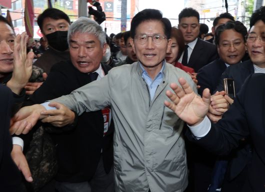 김문수 국민의힘 대선 후보가 6일 경북 포항시 죽도시장을 방문, 지지자들과 인사하고 있다. 연합뉴스 |