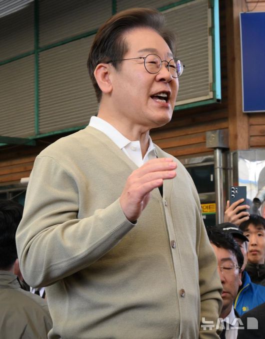 [증평=뉴시스] 조성봉 기자 = 민심을 청취하는 '경청 투어'에 나선 이재명 더불어민주당 대선후보가 6일 충북 증평군 장뜰시장에서 즉흥 연설을 하고 있다.(공동취재) 2025.05.06. photo@newsis.com |