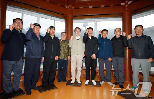(장수=뉴스1) 안은나 기자 = 이재명 더불어민주당 대통령 후보가 골목골목 경청투어 이틀차인 6일 오후 전북 장수군 오옥마을을 찾아 '국내 최연소 이장(1998년생)' 정민수 씨를 비롯한 마을주민들과 간담회를 한 뒤 기념 촬영하고 있다. 2025.5.6/뉴스1