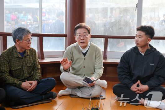 (장수=뉴스1) 안은나 기자 = 이재명 더불어민주당 대통령 후보가 골목골목 경청투어 이틀차인 6일 오후 전북 장수군 오옥마을을 찾아 '국내 최연소 이장(1998년생)' 정민수 씨를 비롯한 마을주민들과 간담회를 하고 있다. 2025.5.6/뉴스1