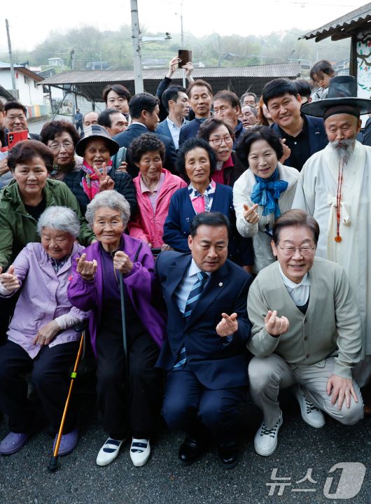 (장수=뉴스1) 안은나 기자 = 이재명 더불어민주당 대통령 후보가 골목골목 경청투어 이틀차인 6일 오후 전북 장수군 오옥마을을 찾아 주민들과 기념 촬영하고 있다. 2025.5.6/뉴스1
