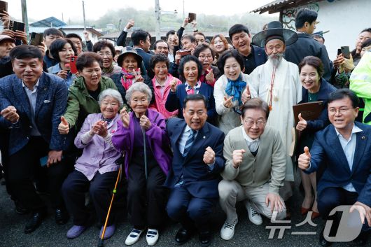 (장수=뉴스1) 안은나 기자 = 이재명 더불어민주당 대통령 후보가 골목골목 경청투어 이틀차인 6일 오후 전북 장수군 오옥마을을 찾아 주민들과 기념 촬영하고 있다. 2025.5.6/뉴스1