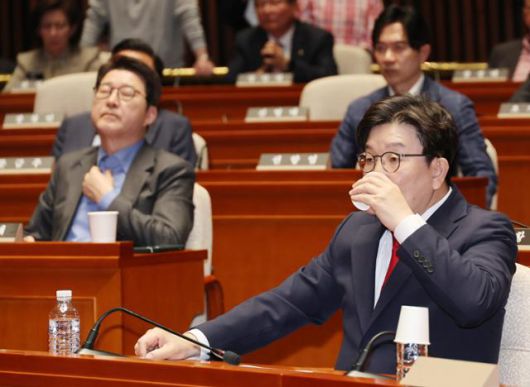 권성동 국민의힘 원내대표가 5일 서울 여의도 국회에서 열린 의원총회에 참석해 물을 마시고 있다. 연합뉴스 |
