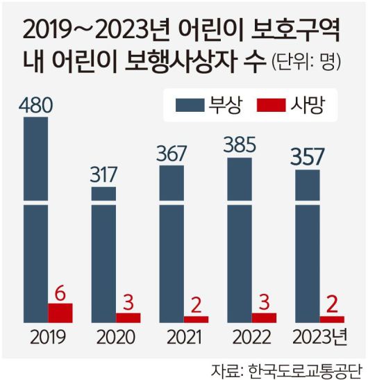 6일 한국도로교통공단(공단)에 따르면 2019~2023년 스쿨존 내 어린이 보행사상자는 1922명으로 16명이 사망했고 1906명이 부상했다. 특히 가정의 달 5월에 234명의 사상자가 나와 스쿨존 사고가 가장 잦았다.