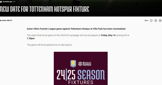 구단은 "토트넘과 빌라 파크(애스턴 빌라 홈구장)에서 경기를 펼칠 예정이다. 이는 이번 시즌(2024-2025) 홈 마지막 경기다. 일정이 5월 17일로 변경됐다"라고 밝혔다.