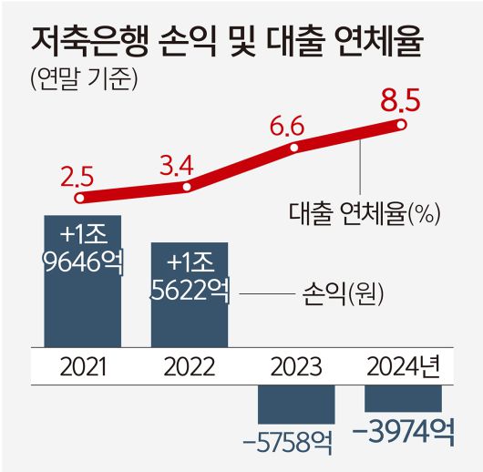 저축은행 업계는 2년 연속 순손실을 기록하며 건전성 지표가 악화하고 있어 구조조정 압박을 받고 있다. 업계 전체 손익은 2023년(-5758억원) 적자 전환 이후 지난해 말 순손실 3974억원을 기록하며 적자 폭을 줄이는 데 그쳤다. 지난해 말 기준 연체율은 8.52%로, 전년 6.55%에서 1.97%포인트 상승했다. 특히 부동산 관련 대출이 많은 기업대출이 같은 기간 8.02%에서 12.81%로 4.79%포인트 급등했다. 저축은행은 부동산 PF 대출에 적극적으로 나섰는데 2022년 레고랜드 사태를 겪으며 부실이 크게 늘었다.