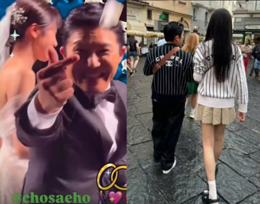 가수 지드래곤이 촬영한 방송인 조세호 결혼식 현장, 신혼여행 중 포착된 것으로 알려진 조세호와 그의 아내 뒷모습 /사진=지드래곤 인스타그램 스토리, 온라인 커뮤니티 |