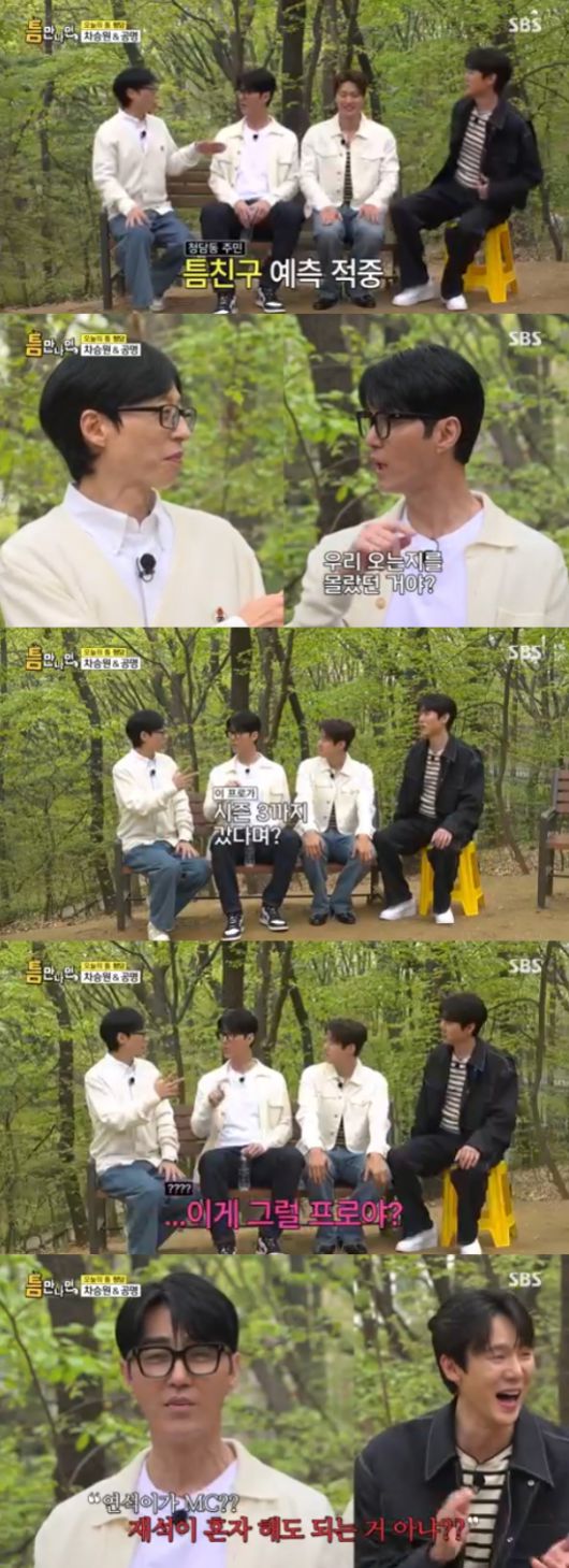 또 차승원은 "'틈만나면'이 시즌3까지 갔다며? 이게 그럴 프로야?"라고 돌직구를 던졌다. 또 차승원은 "연석이가 MC야? 그냥 재석이 혼자서만 해도 되는거 아냐?"라고 말하기도.