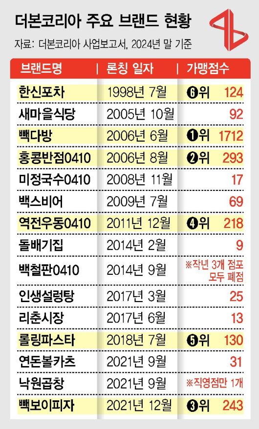 더본코리아는 그동안 여러 프랜차이즈 브랜드를 수시로 만든 뒤 성공하는 1~2개 브랜드에 집중하고 성과가 작은 브랜드는 접거나 지원을 줄이는 전략을 취했다. 이런 까닭에 더본코리아에는 새로 문을 여는 가맹점이 많은 만큼 문을 닫는 가맹점이 많았다.
