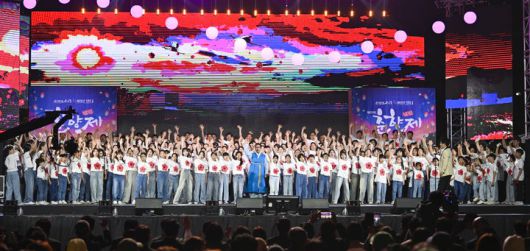 [남원=뉴시스] 지난 4월30일 개막했던 전북 남원의 '제95회 춘향제'가 7일간의 일정을 마치고 6일 폐막했다. 300명 남원시민합창단이 폐막식 공연과 함께 시민과 방문객에게 인사하고 있다. *재판매 및 DB 금지 |