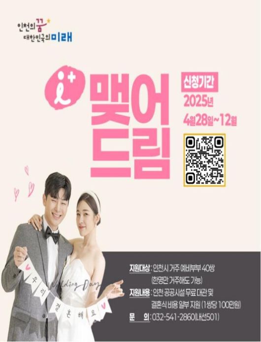 인천시는 이번 사업을 결혼과 출산을 꺼리게 만드는 경제적 부담을 완화해 결혼을 망설임이 아닌 '현실적 선택'으로 전환하는 데 초점을 맞췄다고 설명했다. 신청은 인천시와 계양구가족센터 누리집에 안내된 QR코드를 통해 가능하다.