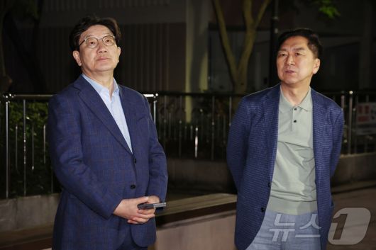 (서울=뉴스1) 김명섭 기자 = 권성동 국민의힘 원내대표와 김기현 의원이 후보 단일화 문제로 당 지도부와 갈등을 겪고 있는 김문수 대통령 후보를 만나기 위해 6일 밤 서울 관악구 김 후보의 집 앞에 도착해 있다. 2025.5.6/뉴스1msiron@news1.krCopyright ⓒ 뉴스1. All rights reserved. 무단 전재 및 재배포, AI학습 이용 금지.