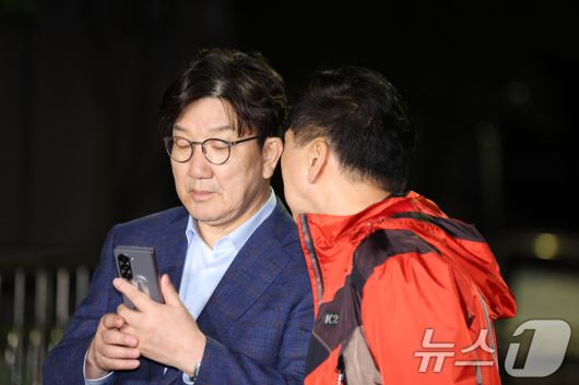 (서울=뉴스1) 김명섭 기자 = 권성동 국민의힘 원내대표와 김기현 의원이 후보 단일화 문제로 당 지도부와 갈등을 겪고 있는 김문수 대통령 후보를 만나기 위해 6일 서울 관악구 김 후보의 집 앞에서 기다리며 대화하고 있다. 2025.5.6/뉴스1