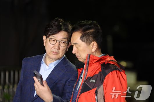 (서울=뉴스1) 김명섭 기자 = 권성동 국민의힘 원내대표와 김기현 의원이 후보 단일화 문제로 당 지도부와 갈등을 겪고 있는 김문수 대통령 후보를 만나기 위해 6일 서울 관악구 김 후보의 집 앞에서 기다리며 대화하고 있다. 2025.5.6/뉴스1msiron@news1.krCopyright ⓒ 뉴스1. All rights reserved. 무단 전재 및 재배포, AI학습 이용 금지.