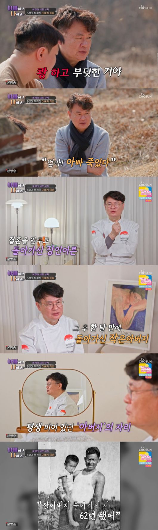6일 방송된 TV조선 '아빠하고 나하고'에는 여경래 셰프가 아들 여민과 함께 아버지 산소를 찾은 모습이 그려졌다.