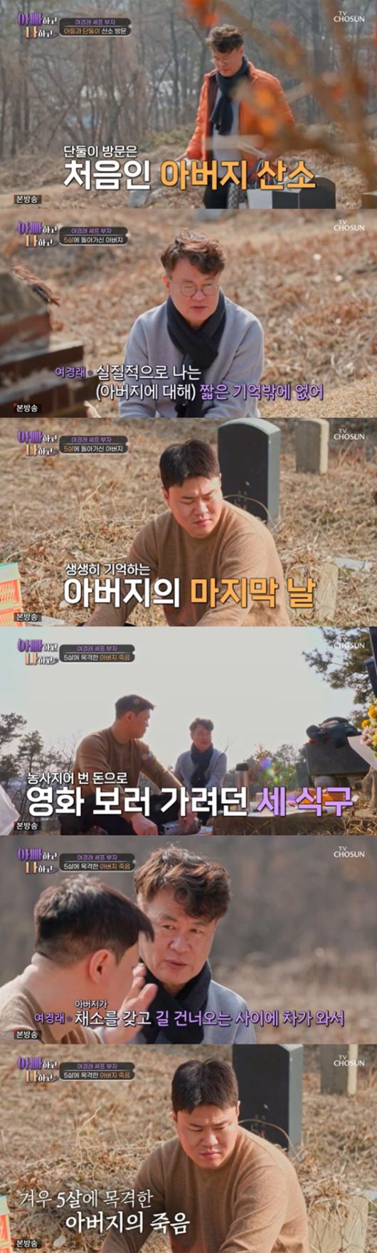 여경래는 아들 여민과 아버지의 산소에 방문해 아버지에 관한 이야기를 꺼냈다. 여경래는 "할아버지 교통사고 당한 날, 그날 원래 식구 셋이서 극장에 가려고 했다. 농사지은 것들을 시장 가서 팔고 판 돈으로 영화 구경을 하려고 했다. 어머니하고 나를 차에 태우고 건너서 채소를 갖고 건너오는 사이에 차가 와서 부딪혔다. 딱 그걸 봤다"라며 아버지의 사고를 목격했던 당시를 떠올렸다.