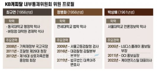 이처럼 기존에도 내부통제위원회를 운영해 왔으나, 금융당국이 지난해 7월 금융권의 내부통제 강화를 위해 '금융회사의 지배구조에 관한 법률(지배구조법)'을 시행함에 따라 이사회 내 내부통제위원회를 신설했다. 기존 운영해 왔던 위원회를 격상한 것이다. 기존 위원회는 KB캐피탈 임직원들이 참여했으나, 이번 정기주총을 통해 정관을 변경하고 전원 사외이사로만 구성했다.