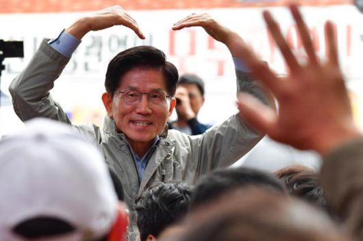 김문수 국민의힘 대선후보가 6일 경북 포항시 죽도시장에서 지지자들에게 손 하트를 만들어 보이고 있다. 뉴스1 |