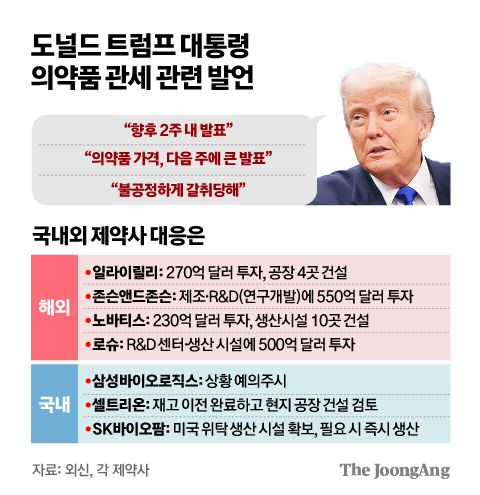 로이터통신은 “트럼프가 계획을 강행한다면, 미국은 2000억 달러(약 278조원) 이상의 처방약을 수입하고 있는 만큼 제약업계에 큰 타격이 있을 것”이라고 보도했다. 트럼프 취임 이후 일라이 릴리, 머크(MSD), 존슨앤드존슨, 노바티스, 로슈, 애브비, 암젠 등 글로벌 제약사들은 이미 미국 내 생산 기지 확대를 위한 투자를 잇달아 발표하며 대책을 준비해왔다.