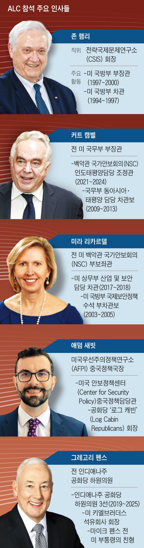 한편, 존 햄리 전략국제문제연구소(CSIS) 회장과 로버트 앳킨슨 정보기술혁신재단(ITIF) 회장 등 미국 최고의 싱크탱크 수장들도 ALC를 찾아 안보는 물론 첨단 기술과 산업 정책까지 포괄하는 한미 관계의 미래를 조망할 예정이다. 또 미 국무부에서 25년간 근무하며 트럼프 행정부 1기와 바이든 행정부 시절 국가안전보장회의(NSC)에 몸담았던 베테랑 외교관 출신 헨리 해거드 주한미국상공회의소(AMCHAM) 수석고문은 이번 ALC에서 정치·경제적 대립을 떠나 ‘트럼프 2.0’ 행정부의 산업 정책에서 한미 기업들이 협업할 수 있는 전략을 모색한다.