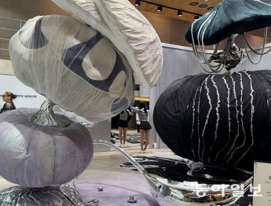 지난달 28일 서울 강남구 신사동 ‘아이아이컴바인드 하우스도산’ 매장 1층에서 관람객들이 아이웨어 브랜드 ‘젠틀몬스터’와 프랑스 패션 브랜드 ‘메종 마르지엘라’의 협업으로 제작된 대형 설치 미술 작품을 둘러보고 있다. 김다연 기자 damong@donga.com |