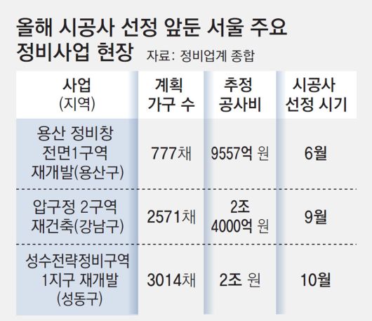 반면 사업성이 높지 않은 정비사업은 시공사 선정에 난항을 겪고 있다. 지난달 시공사 입찰을 진행한 노원구 상계주공5단지 재건축, 영등포구 문래동4가 도시환경정비구역 재개발 사업에는 아무도 응찰하지 않았다. 백준 J&K도시정비 대표는 “당분간 입지에 따라 시공사 관심이 확연히 차이 나는 ‘양극화 현상’이 이어질 것”이라고 전망했다.