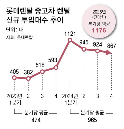 6일 금융감독원 전자공시에 따르면 지난해 롯데렌탈의 렌털 사업에 투입된 신규 중고차는 분기당 평균 965대로 전년(474대)의 두 배 수준으로 증가했다. 올해는 분기당 평균 1176대가 투입될 것으로 전망된다.