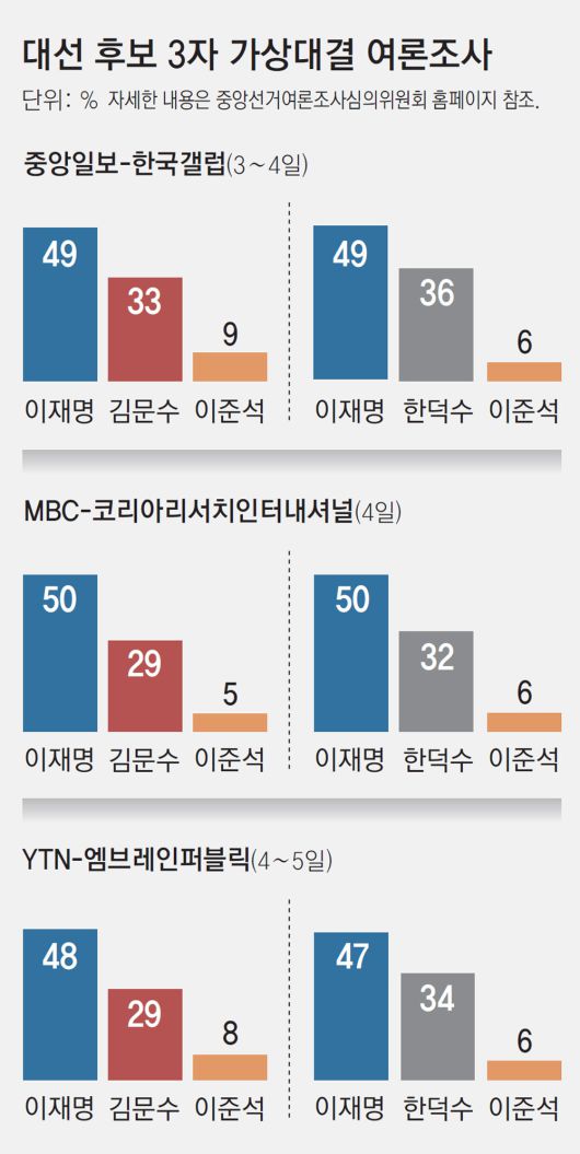 6일 중앙일보·한국갤럽이 3, 4일 이틀간 실시한 여론조사에 따르면 김 후보와 한 전 총리의 단일화가 김 후보로 성사될 경우 ‘이재명(49%)-김문수(33%)-이준석(9%)’이었고 한 전 총리로 단일화될 경우 ‘이재명(49%)-한덕수(36%)-이준석(6%)’으로 조사됐다. MBC·코리아리서치인터내셔널의 조사에선 각각 ‘이재명(50%)-김문수(29%)-이준석(5%)’, ‘이재명(50%)-한덕수(32%)-이준석(6%)’으로 집계됐다. 두 여론조사 모두 김 후보와 한 전 총리와의 지지율 차이가 오차범위 내에 머무르면서 경쟁력 차이가 별로 없는 것으로 나타난 것이다.