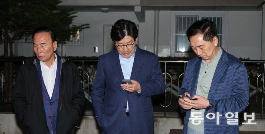 김문수 집앞의 권성동 국민의힘 권성동 원내대표가 한덕수 전 국무총리와의 단일화 압박에 반발해 대선 후보 일정 중단을 선언한 김문수 대선 후보를 만나기 위해 6일 밤 서울 관악구 김 후보의 집 앞에서 기다리며 전화기를 보고 있다. 왼쪽부터 박덕흠 의원, 권 원내대표, 김기현 의원. 전영한 기자 scoopjyh@donga.com |