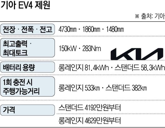 EV4의 가격은 스탠다드 모델 기준 4192만 원부터, 롱레인지 모델은 4629만 원부터 시작된다. 서울 기준 보조금을 적용하면 스탠다드는 3400만 원대, 롱레인지는 3800만 원대로 내려간다. 풀옵션 트림인 GT-라인 롱레인지도 보조금 적용 시 4000만 원대 후반에 구매할 수 있다.
