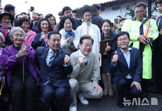 [장수=뉴시스] 조성봉 기자 = 민심을 청취하는 '경청 투어'에 나선 이재명 더불어민주당 대선후보가 6일 전북 장수군 천천면 오옥마을에서 주민들과 기념촬영을 하고 있다.2025.05.06. suncho21@newsis.com |