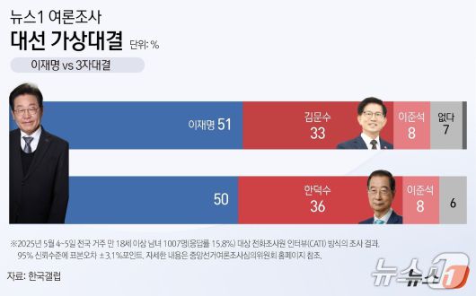 뉴스1이 여론조사업체 한국갤럽에 의뢰해 지난 4일부터 5일까지 전국 18세 이상 남녀 1007명을 대상으로 이재명 후보, 김문수 국민의힘 후보, 이준석 개혁신당 후보 간의 3자 대결 구도 시 후보 선호도를 조사한 결과, 이재명 후보는 51%의 지지율을 기록하며 1위를 차지했다.
